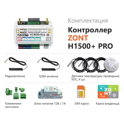 Контроллер ZONT H1500+ PRO предназначен для профессиональной автоматизации инженерных систем и дистанционного управления ими. Контролирует и управляет системой отопления с функцией приготовления горячей воды. Прибор обладает возможностями гибкого программирования для решения задач автоматизации котельной. Алгоритм работы контроллера может учитывать температуру наружного воздуха и недельное расписание.